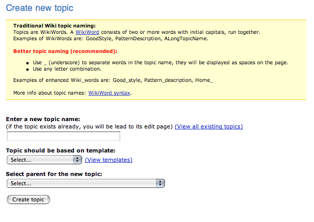 Arthur - is there a way to make it obvious to the user that they do not need to choose a template or parent? If I were new to the twiki I would decide i wanted to create a topic, goto here, spend too much time deliberating about the right topic name to choose (maybe a hint that you can always re-name would be good), and then start trying to figure out what the templates do / mean etc... al the while not satisfying my original desire - to create a new topic (ignoring totally the time it takes to see if you are duplicating some other content (which i think we should encourage new users not to worry about))