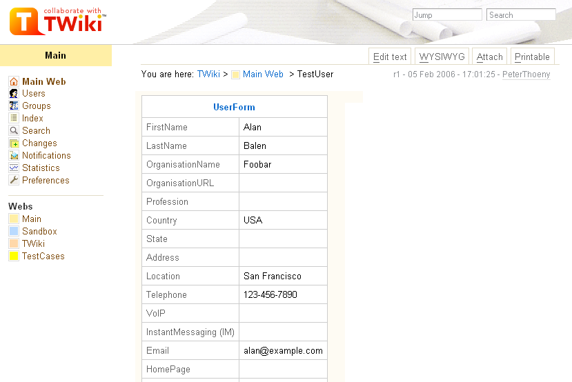 - Absolutely agree, it does not make sense for a public TWiki. It does though for a wiki at the workplace. TWiki serves both, the current setting is for deployments as defined in the TWikiMission. May be it helps to find a middle ground, e.g. add some fields used by public wikis? The admin can customize of topic to get the desired output, as documented in the UserHomepageHeader help text and in the UserHomepageSupplement. -- PTh