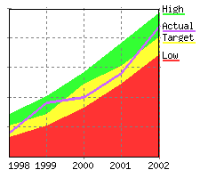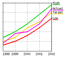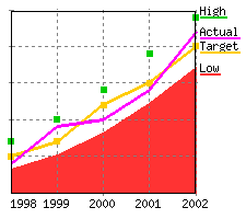 The source data displayed on the chart. Values specified with data are displayed relative to the left Y axis while values specified with data2 are displayed relative to the right Y axis. In both cases, they define either a range of table cells or explicit data values. For example for type="line", a data="R2:C3..R999:C6" would say that four lines were to be drawn with the first line being rows 2-999 column 3 and last line being rows 2-999 column 6. In the case of a scatter graph, data represents the actual Y values. Note: Reversed data is allowed so data="R999:C6..R2:C3" is a legal data specification. Explicit data is also allowed so data="R999:C6..R2:C3,0" would draw 5 lines, the first 4 coming from the table and the 5th having a constant value of 0. |