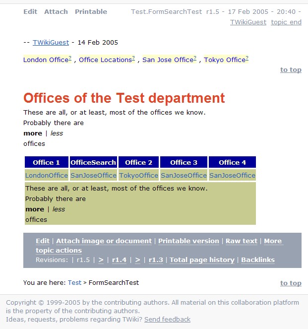 | Office 2 | select | 1 | , %SEARCH{"Office$" scope="topic" web="Main" nototal="on" nosummary="on" nosearch="on" regex="on" format="Main.$topic" separator=", " }% | | |