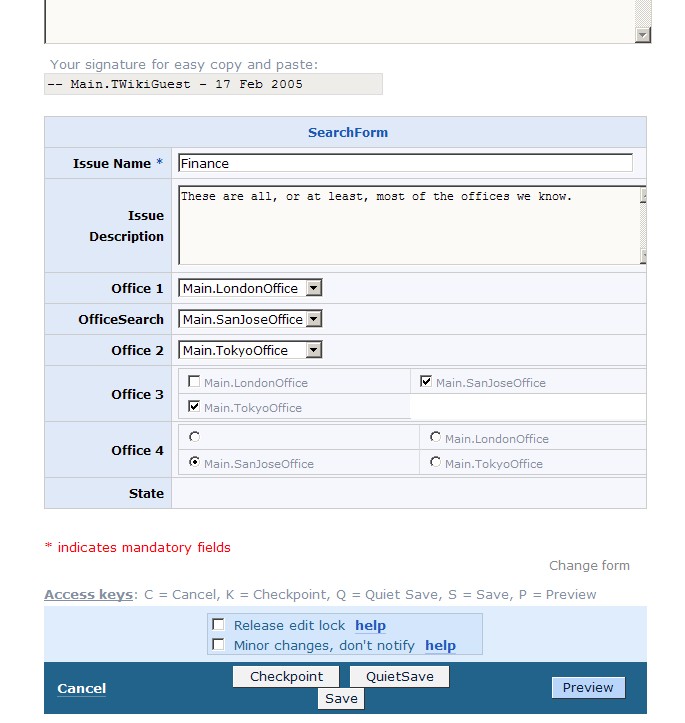 - Set SHORTDESCRIPTION = Enhance TWiki forms with control over layout, support for initial form field values, support for mandatory form fields