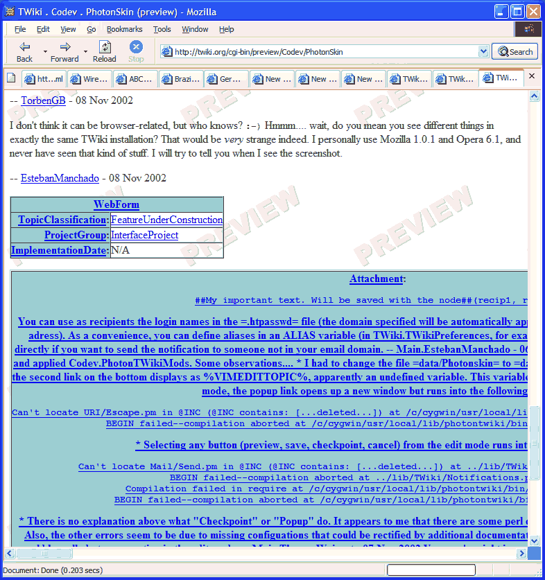 cd $TWIKIDIR/lib/TWiki patch <$PATCHDIR/twiki-prefs-pm.patchSet the SKIN to "photon" (in TWikiPreferences, *.WebPreferences o in your own user topic). Be sure you have email addresses in all your user topics, for the notifications to work right, and that you have WIKIWEBMASTER and SMTPSENDERHOST set correctly, just in case. Optionally, you can also set variables ALIAS and VALID_DOMAIN_ACCOUNTS (see notifications, below). Customize the file lib/TWiki/Notifications.pm with your message template in line 35, if you want to use notifications (see the notification syntax in the next section).