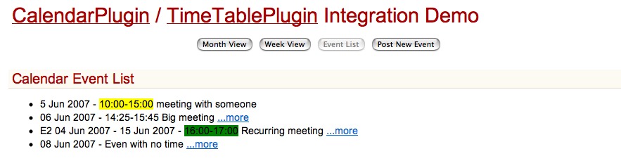 - In addition to CalendarPlugin and TimeTablePlugin, this setup uses ToolTipPlugin (which was used by TimeTablePlugin), IfDefinedPlugin, and GluePlugin. GluePlugin really isn't necessary. I just use it because I find it useful. If you don't use it, you'll need to reformat a couple of the tags (which should be fairly self-evident if you look at the code). Likewise, the use of IfDefinedPlugin could be replaced with IfStatements to reduce the requirements. (Again, I just find IfDefinedPlugin easier to use.)