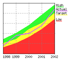 The source data displayed on the chart. Values specified with data are displayed relative to the left Y axis while values specified with data2 are displayed relative to the right Y axis. In both cases, they define either a range of table cells or explicit data values. For example for type="line", a data="R2:C3..R999:C6" would say that four lines were to be drawn with the first line being rows 2-999 column 3 and last line being rows 2-999 column 6. In the case of a scatter graph, data represents the actual Y values. Note: Reversed data is allowed so data="R999:C6..R2:C3" is a legal data specification. Explicit data is also allowed so data="R999:C6..R2:C3,0" would draw 5 lines, the first 4 coming from the table and the 5th having a constant value of 0. |