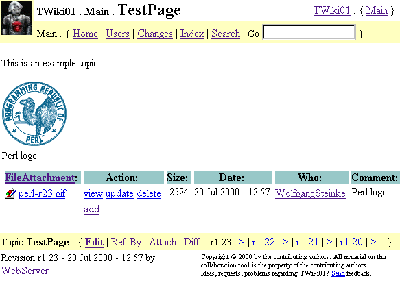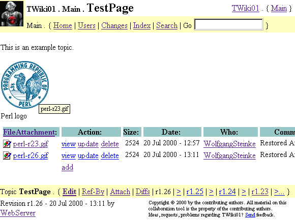 -- PeterThoeny - 22 Jul 2000 I agree with PeterThoeny that the file name left as the original would be best. I think it was cleaver the way you took advantage of the current versioning to find the name(s) of the attachments. But my users and myself would prefer a versioning number that started as 1.1 and incremented monotonically. With the current scheme they would be confused. I think this is a good start and I will try to come up with some constructive sugestions later on this week. -- HaroldGottschalk - 22 Jul 2000 Thank you for your sugesstions regarding the file revision info and the update procedure! We have modified our concept as follows: