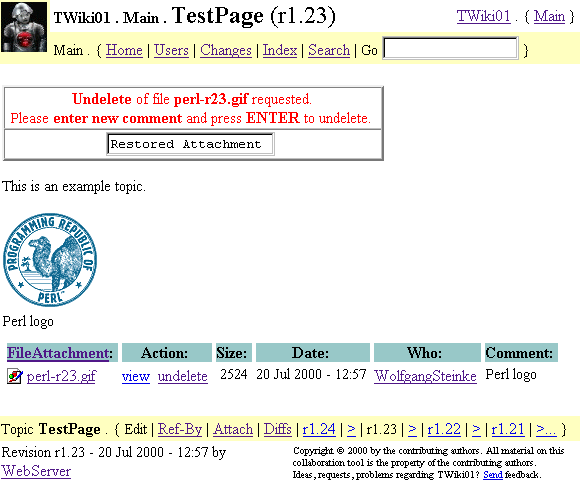 The DeleteAttachment topic is not only about deleting attachments, but also about version control. I like the idea of version controlling the attachments, this is a feature that has been requested sometimes. Thank you for sharing your ideas. Do you intend to share the Perl code as well? Very good idea to remove the file from the table when deleting the attachment, but to leave the actual file untouched. The main TWiki core should be extended with this feature. Some issues need to be addressed: