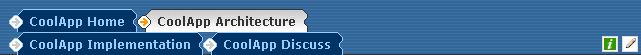 Let's assume that we want to add the tabs to a set of topics related to CoolApp, namely CoolAppHome, CoolAppArch, CoolAppImpl and CoolAppDiscuss, we would add the following lines to the top of each of these topics: