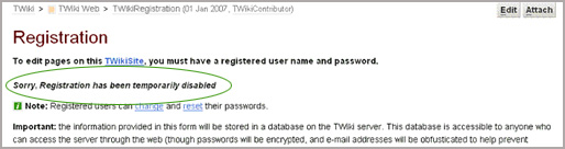 Obstacle One: Users cannot register, which results in their names not appearing within the list of TWiki Users (TWikiUsers).