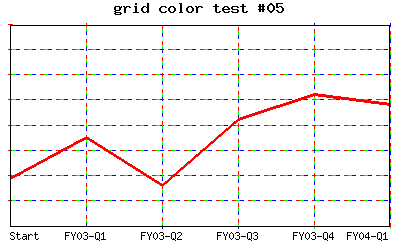 Change the grid style to be 4 red dots, 4 green dots, 4 blue dots and 4 transparent dots. %CHART{name='colorTest05' table='table1' data='R2:C7..R7:C7' xaxis='R2:C2..R7:C2' title='grid color test #05' xgrid='on' ygrid='on' gridcolor='#FF0000, #FF0000, #FF0000, #FF0000, #00FF00, #00FF00, #00FF00, #00FF00, #0000FF, #0000FF, #0000FF, #0000FF, transparent, transparent, transparent, transparent' ygrid='dot' xgrid='dot'}% |
