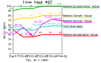 Same as above except add an additional data set (averages) that is calculated by %CALC%. %CHART{name='lineTest27' topic='ChartPluginTestsRemote' table='tableRemote2' type='line' data='R4:C2..R8:C7' xaxis='R2:C2..R2:C7' title='line test #27' yaxis='on' ymin='0' ymax='100' ylabel='Hello there' xlabel='Yep, an X label' datalabel='off off on box' legend='R4:C1..R8:C1' ygrid='off' xgrid='off'}% |