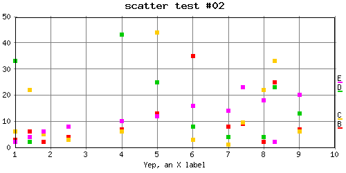 Restore bgcolor and add ygrid = on (changing from dotted ygrid to solid ygrid) to above. %CHART{name='lineTest20' table='table1' type='line' data='R2:C4..R7:C7' xaxis='R2:C2..R7:C2' title='line test #20' yaxis='on' ymin='0' ymax='100' ylabel='Hello there' xlabel='Yep, an X label' datalabel='off off on box' legend='R1:C4..R1:C7' ygrid='on'}% |